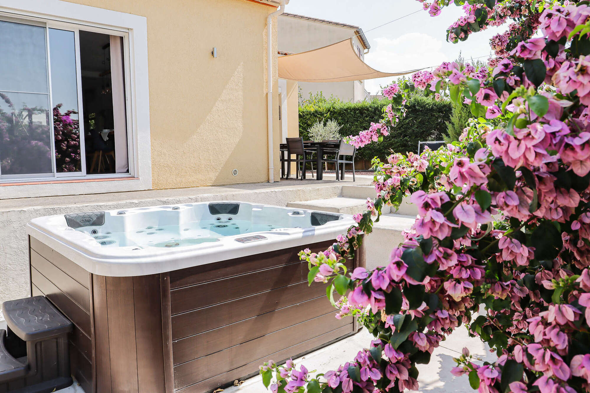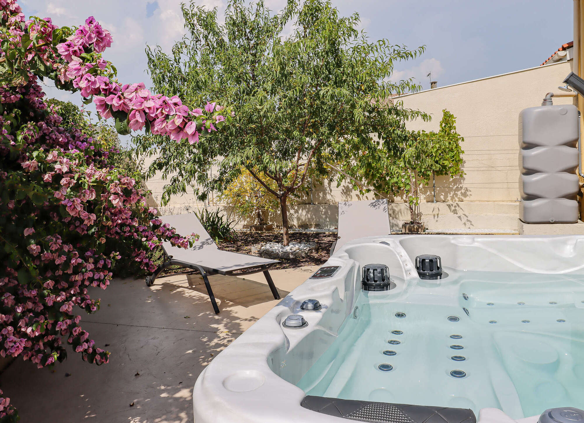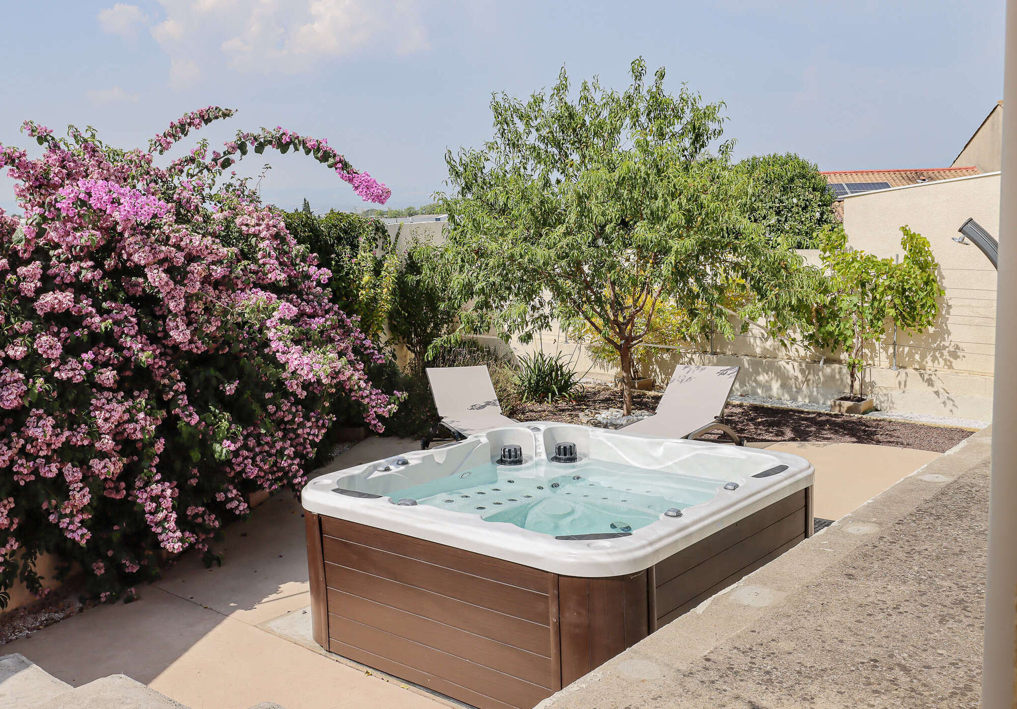 La maison comprend un jardin avec mobilier d'extérieur et un garage pouvant abriter vos vélos, motos ou votre voiture et un jacuzzi privatif.